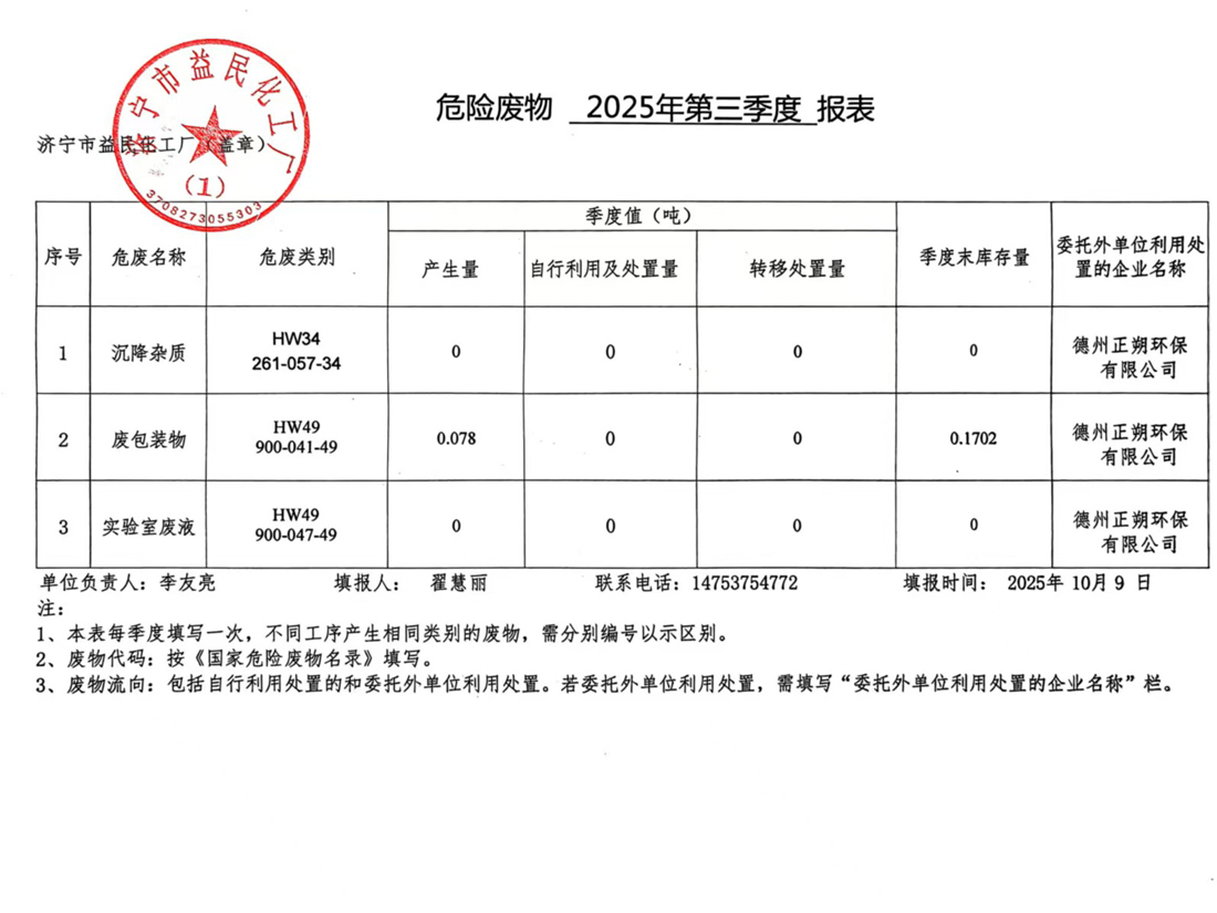 危险废物2025年第三季度报表